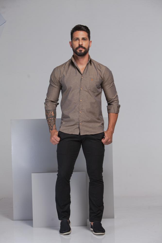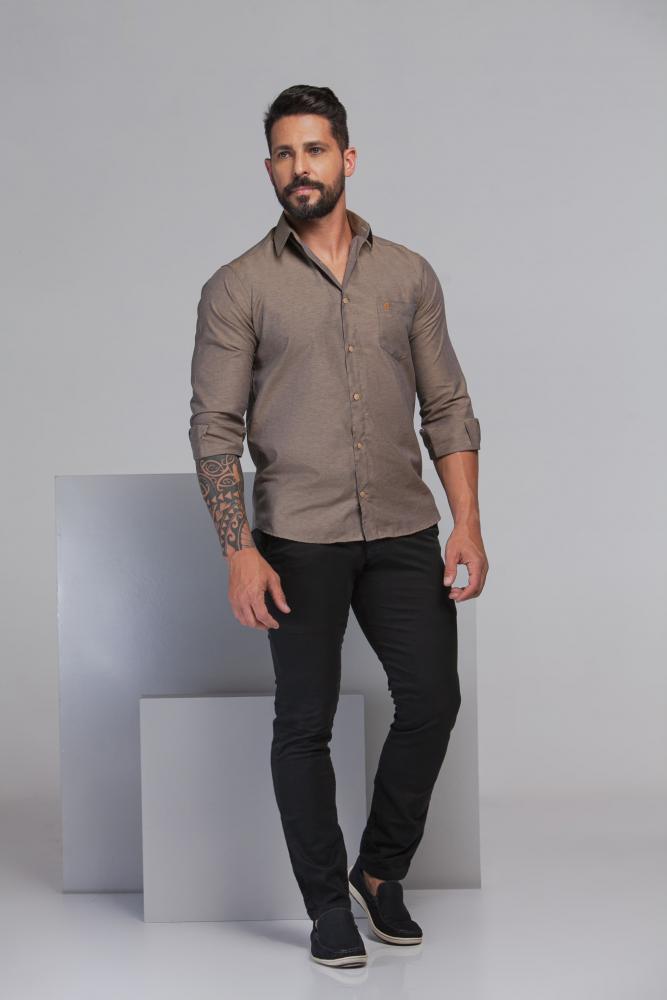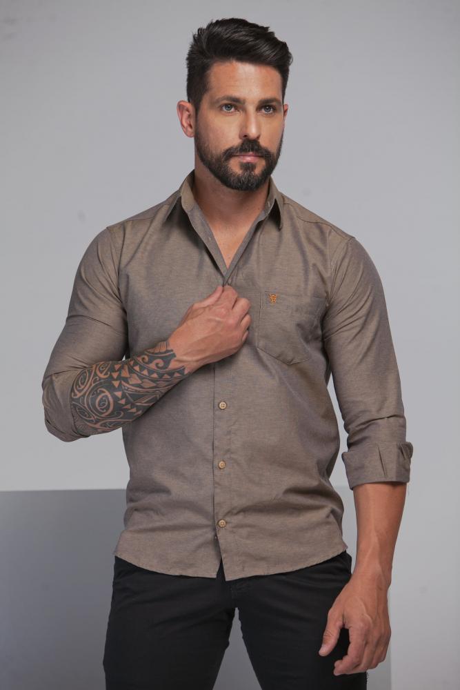 CAMISA MASCULINA SOCIAL TRADICIONAL MANGA LONGA OCRE